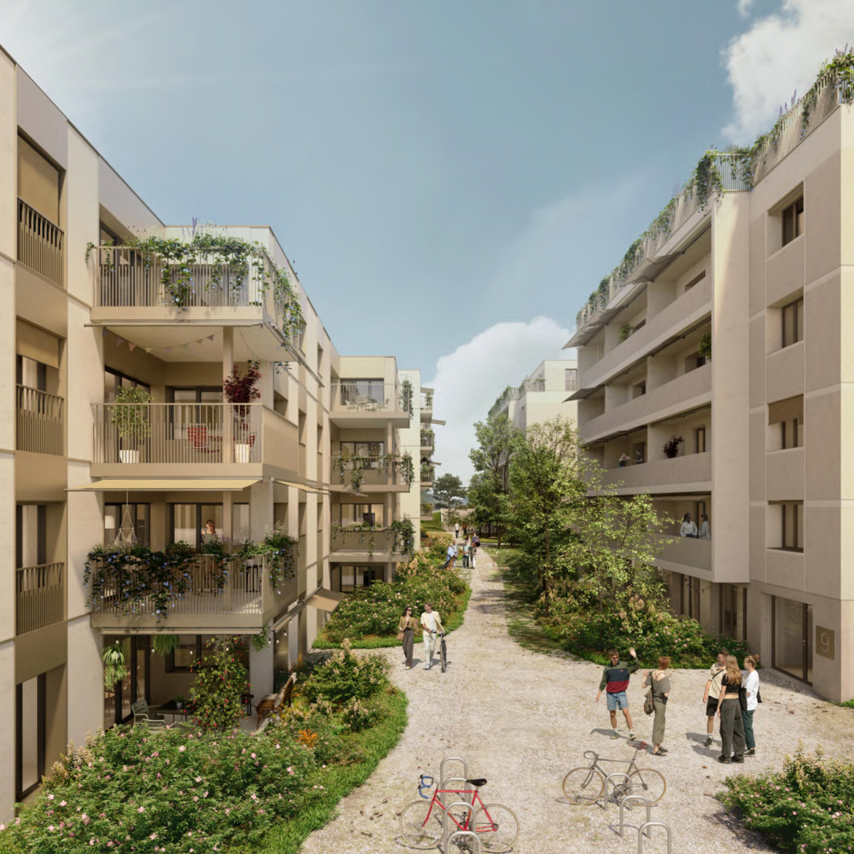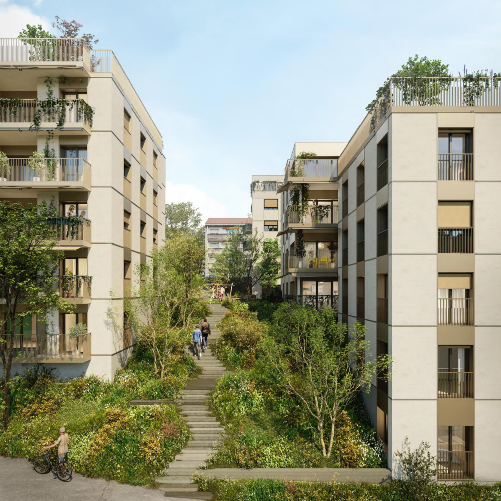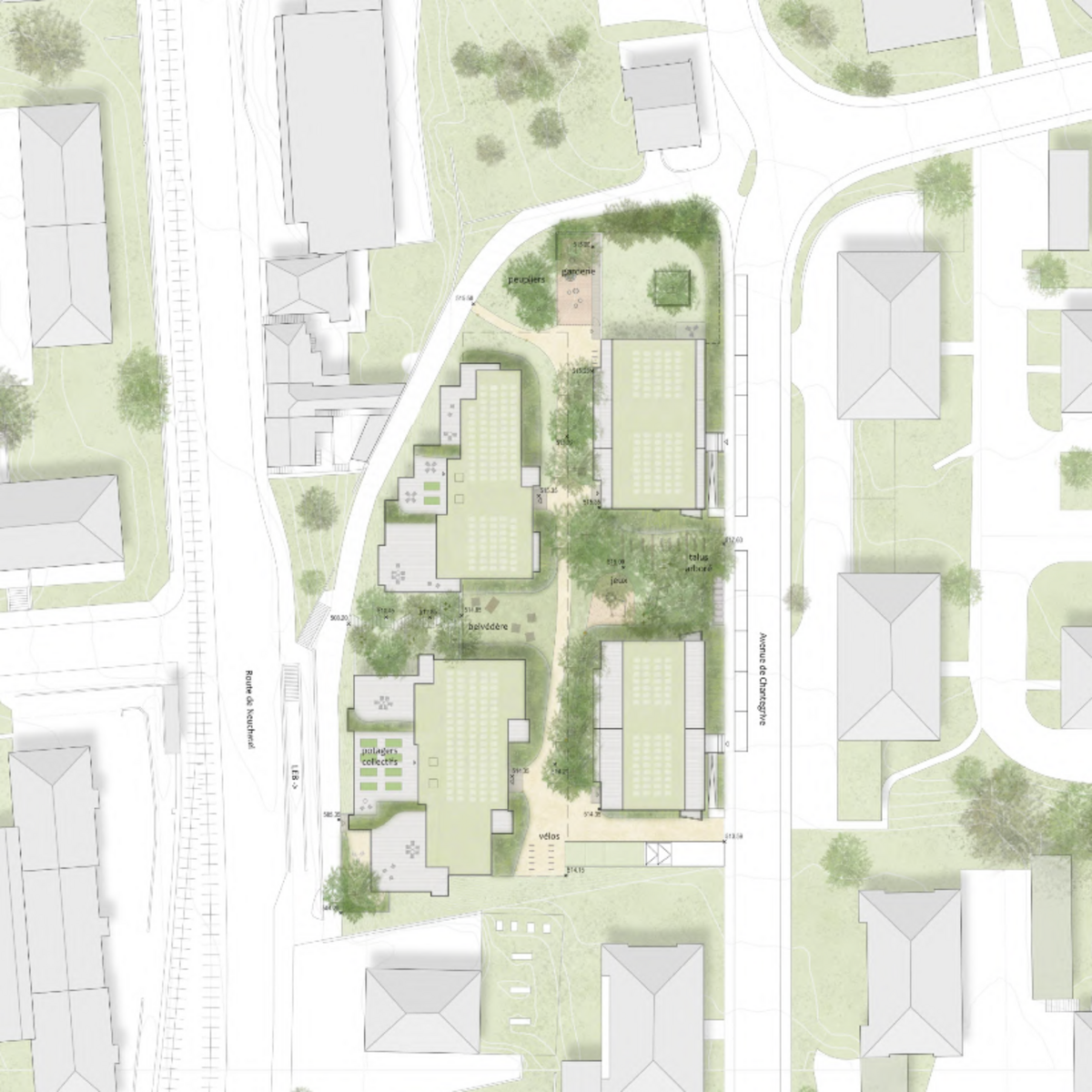 Das Projekt überzeugt in seiner städtebaulichen Setzung, indem es die Gebäudetypologie des Quartiers aufnimmt und zwei neue Gebäude platziert. Zwischen den Gebäuden erstreckt sich ein weiter Fussweg und führt so die Bewohner dem terrassierten Gelände entlang zu den Haupteingängen der Gebäude. Die geschickte Höhenstaffelung vereint den öffentlichen und privaten Aussenraum sowie den Neubau und den Bestand. Die Grundrisse der Neubauten sind mittels Fünf- bzw. Sechsspännern eine sehr kompakte Herangehensweise, welche eine solide Grundlage für spannende und gut ausgerichtete Grundrisse legt.