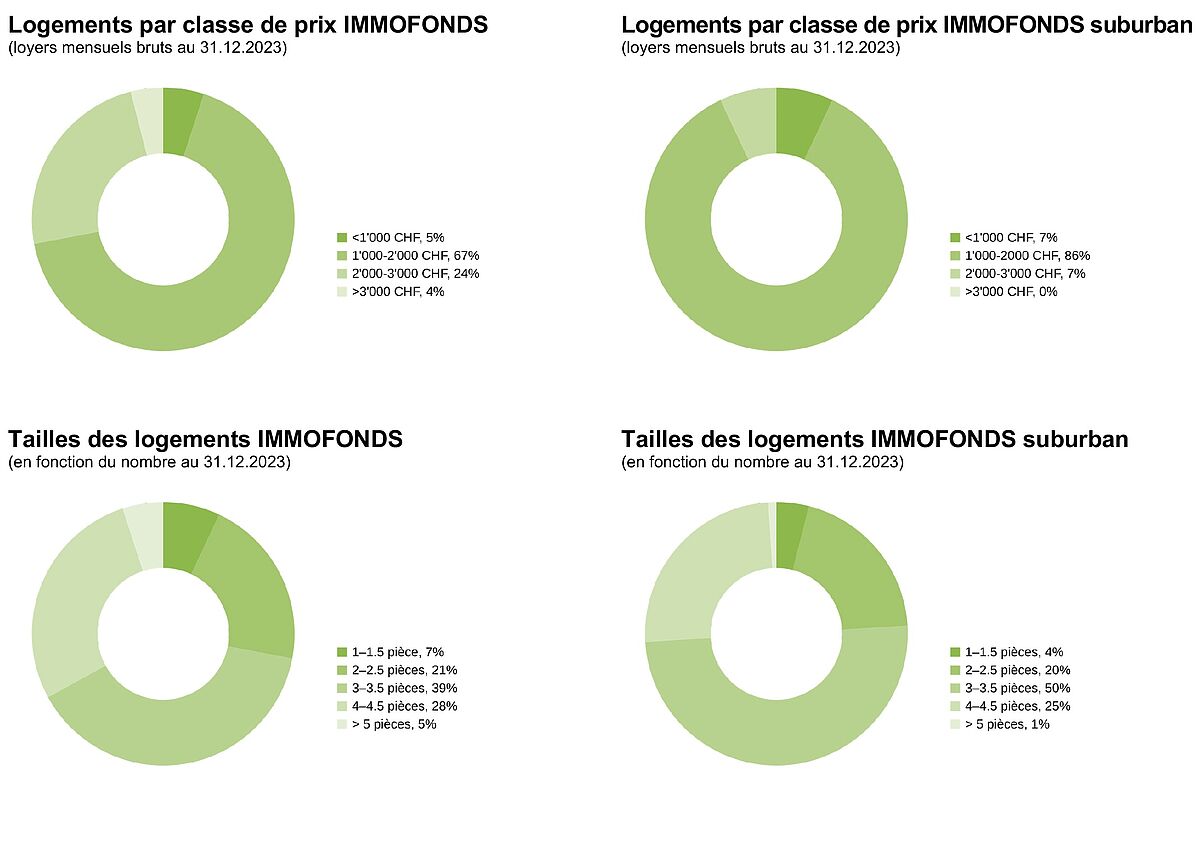 L’IMMOFONDS suburban parvient à offrir des loyers abordables en concentrant son portefeuille dans des localités d’importance régionale. Une part de 93% des loyers bruts est inférieure à CHF 2000 par mois. Il s’agit essentiellement de logements de deux à quatre pièces. Pour l’IMMOFONDS, dont le portefeuille couvre les centres urbains et les agglomérations, la part de loyers bruts inférieure à CHF 2 000 s’élève à 72%. Une proportion de 88% des logements compte entre deux et quatre pièces. Les deux portefeuilles proposent, selon l’emplacement, différents loyers et tailles d’habitations qui couvrent un large éventail de revenus et de modes de vie